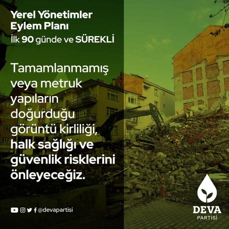 • Tamamlanmamış veya metruk yapıların doğurduğu görüntü kirliliği, halk sağlığı ve güvenlik risklerini önleyeceğiz.