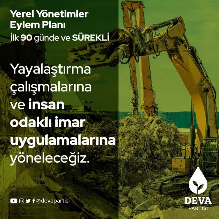 Şehirler, afetlere dirençli yapılanmalıdır. DEVA Partisi söz sahibi olduğunda doğa, insan, teknoloji kaynaklı veya hibrit afetlere dirençli şehirler Eylem Planımızda resmettiğimiz Yerel Yönetimler ve Şehircilik politikamızın genel çerçevesinin doğal sonucu olarak ortaya çıkacaktır.